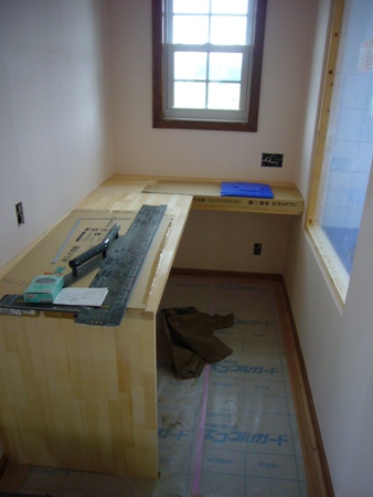 PC、プリンター、電話&FAXと仕事関係の書類や本などを収納する予定の場所です。作業がしやすいようにL字型のデスクにして頂きました。本当は壁に作りつけの書棚を作って頂きたかったのだけど、予算の関係で出来ませんでした。だけどデッドスペースになってしまうから、ここの壁に書棚欲しいな~。自分で作れるかな?!