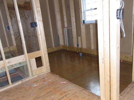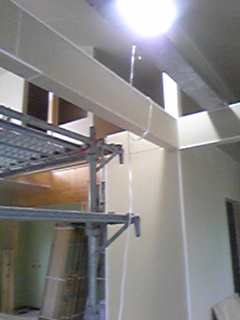 前回見に行った時は断熱材を敷き詰めている最中でしたが、既に室内の梁や壁はこんな感じで全てボードが張られていました。