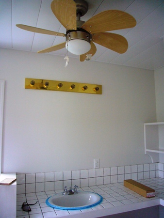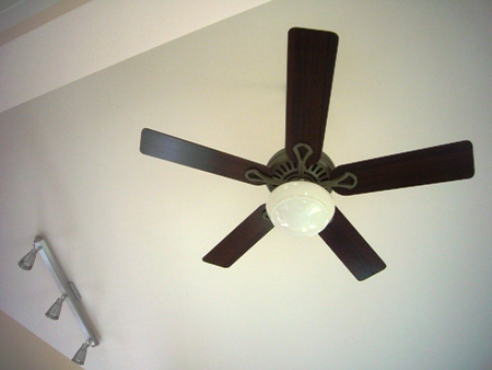 リビングのシーリングファンとキッチンの電気。