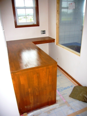 PC、プリンター、電話&FAXと仕事関係の書類や本などを収納する予定の場所です。作業がしやすいようにL字型のデスクにして頂きました。本当は壁に作りつけの書棚を作って頂きたかったのだけど、予算の関係で出来ませんでした。だけどデッドスペースになってしまうから、ここの壁に書棚欲しいな~。自分で作れるかな?!
